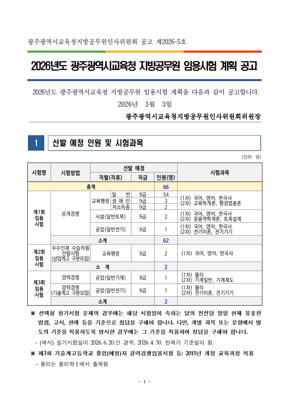 2026³âµµ ±¤ÁÖ±³À°Ã» Áö¹æ°ø¹«¿ø ÀÓ¿ë½ÃÇè ½ÃÇà°èȹ °ø°í (66¸í ä¿ë)